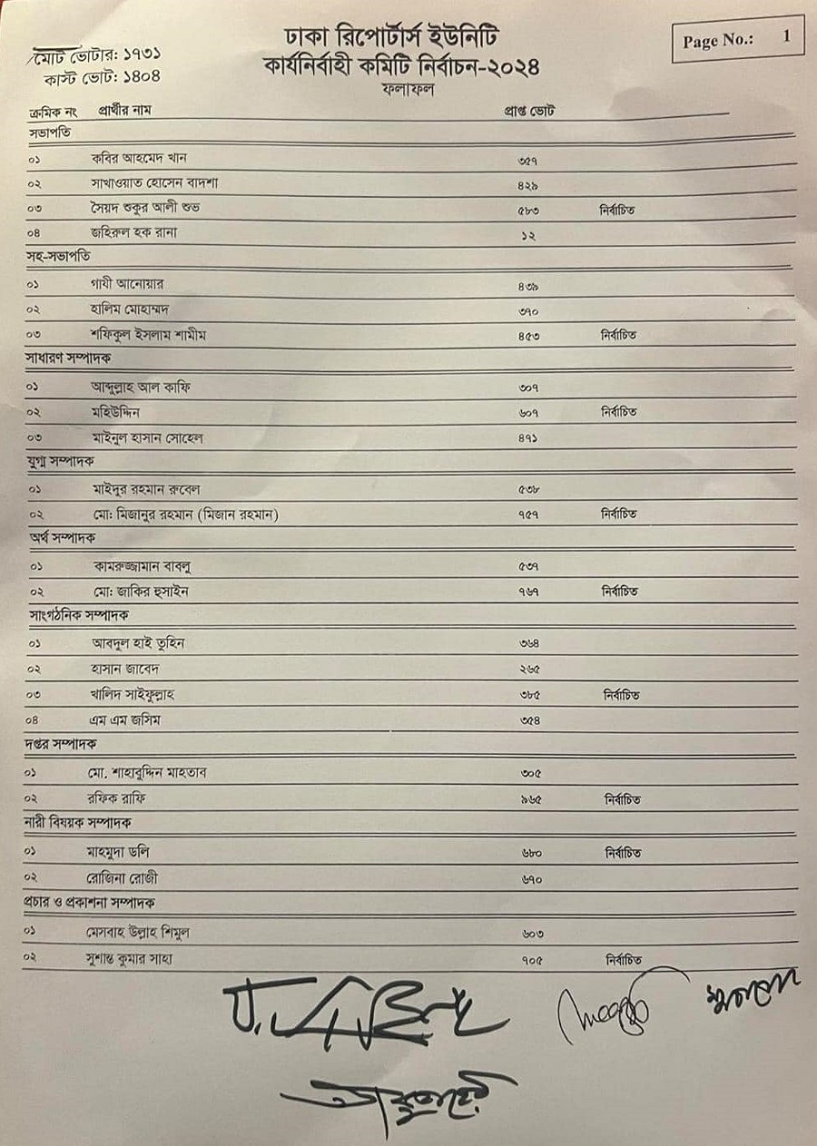 নির্বাচনে সৈয়দ শুকুর আলী শুভ ৫৮৩ ভোট পেয়ে সভাপতি নির্বাচিত হয়েছেন। আর মহিউদ্দিন সর্বোচ্চ ৬০৭টি ভোট পেয়ে সাধারণ সম্পাদক হিসেবে নির্বাচিত হন। এদিকে, সভাপতি পদে কবির আহমেদ খান পেয়েছেন ৩৫৭ ভোট। সাখাওয়াত হোসেন বাদশা ৪২৯টি ভোট, জহিরুল হক রানা ১২টি ভোট পেয়েছেন।