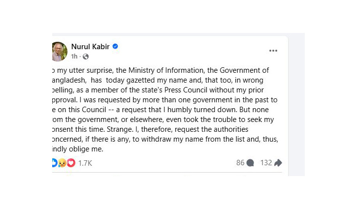 ফেসবুক পোস্টে নূরুল কবীর লিখেছেন, চরম বিস্ময়ের সঙ্গে আজ জানতে পারলাম, বাংলাদেশ সরকারের তথ্য মন্ত্রণালয় আমাকে রাষ্ট্রের প্রেস কাউন্সিলের সদস্য হিসেবে গেজেট করেছে, তা-ও আমার নামের ভুল বানানে এবং আমার পূর্বানুমতি ছাড়াই।