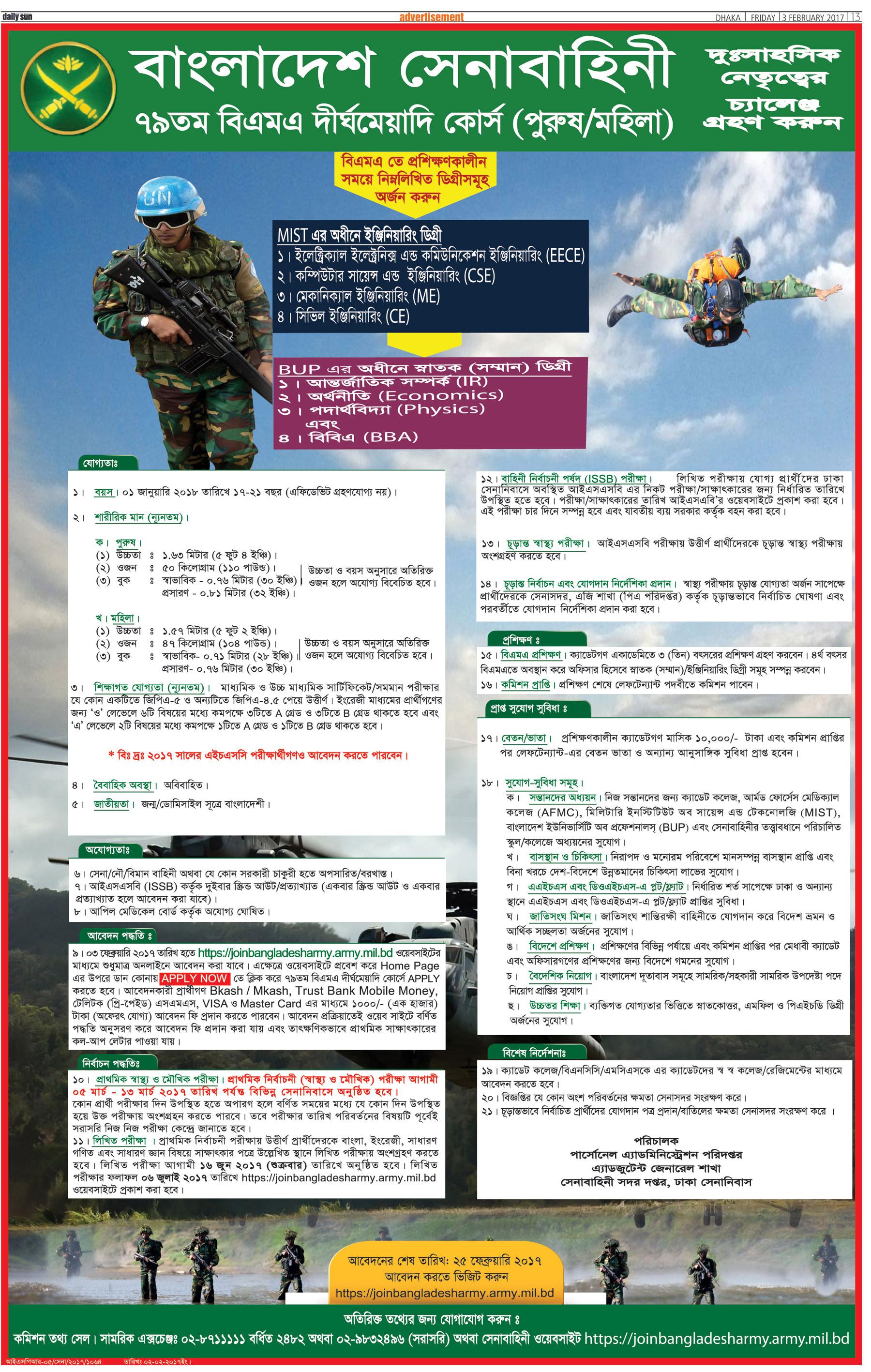 আবেদন পদ্ধতি : বাংলাদেশ সেনাবাহিনীর ওয়েবসাইটের (www.joinbangladesharmy.mil.bd) মাধ্যমে শুধু অনলাইনে আবেদন করা যাবে। আবেদনকারী প্রার্থীগণ বিকাশ/এমক্যাশ, ট্রাস্ট ব্যাংক মোবাইল মানি, টেলিটক (প্রি-পেইড) এসএমএস, ভিসা ও মাস্টার কার্ডের মাধ্যমে এক হাজার টাকা (অফেরৎযোগ্য) ফি প্রদান করতে পারবেন। আগামী ২৫ ফেব্রুয়ারি ২০১৭ তারিখ পর্যন্ত  আবেদন করা যাবে।
