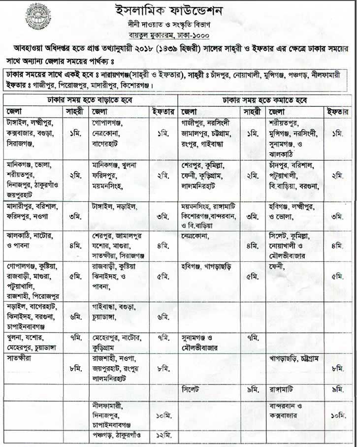 অন্য জেলার সাহরি এবং ইফতার সময় নিম্নের ছকে পাওয়া যাবে-