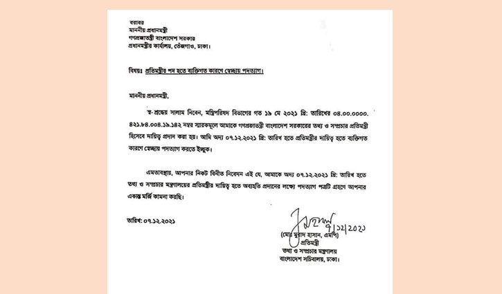 মঙ্গলবার (৭ ডিসেম্বর) ইমেইলে পাঠানো পদত্যাগপত্রে তিনি লিখেছেন, ‘গত ১৯ মে ২০২১ স্মারকমূলে আমাকে গণপ্রজাতন্ত্রী বাংলাদেশ সরকারের তথ্য ও সম্প্রচার প্রতিমন্ত্রী হিসেবে দায়িত্ব দেওয়া হয়। আমি অদ্য ৭ ডিসেম্বর ২০২১ থেকে প্রতিমন্ত্রীর দায়িত্ব থেকে ব্যক্তিগত কারণে স্বেচ্ছায় পদত্যাগ করতে ইচ্ছুক। এমতাবস্থায় আপনার কাছে বিনীত নিবেদন এই যে, আমাকে অদ্য ৭ ডিসেম্বর তারিখ থেকে তথ্য ও সম্প্রচার মন্ত্রণালয়ের প্রতিমন্ত্রীর দায়িত্ব থেকে অব্যাহতি দিয়ে পদত্যাগপত্রটি গ্রহণে আপনার একান্ত মর্জি কামনা করছি।’