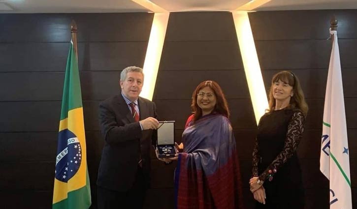 মঙ্গলবার (৭ জুন) বাংলাদেশে নিযুক্ত ব্রাজিলের রাষ্ট্রদূত জোয়াও তাবাজরা ডি অলিভেরা জুনিয়রের হাত থেকে তিনি এ পদক গ্রহণ করেন।
