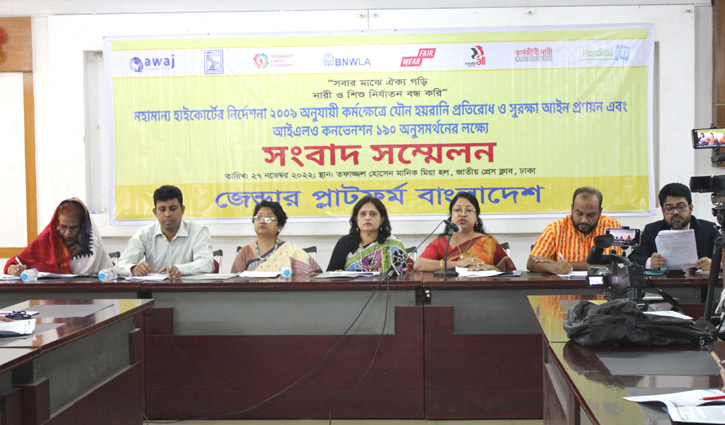 কর্মস্থল ও শিক্ষাপ্রতিষ্ঠানে সব ধরনের যৌন সহিংসতা ও নির্যাতন প্রতিরোধে ‘যৌন হয়রানি প্রতিরোধ ও সুরক্ষা আইন’ প্রণয়ন এবং আইএলও কনভেনশন-১৯০ ‘ইলেমিনেশন অব ভায়োলেন্স অ্যান্ড হেরাসমেন্ট ইন দি ওয়ার্ল্ড অব ওয়ার্ক’ অনুসমর্থনের আহ্বান জানিয়েছে শ্রম অধিকার নিয়ে কাজ করা সংগঠনের জোট জেন্ডার প্ল্যাটফর্ম বাংলাদেশ।
