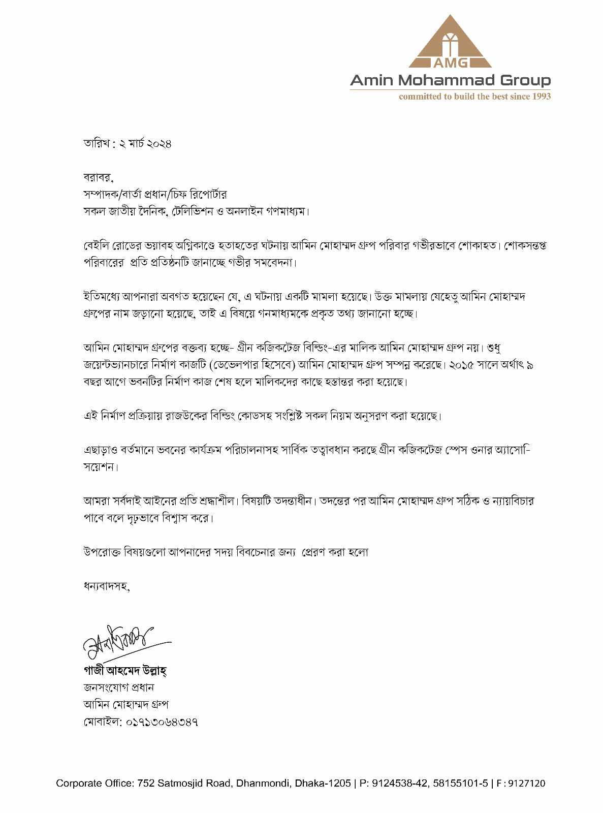 বেইলি রোডে আগুন: আমিন মোহাম্মদ গ্রুপের বিবৃতি