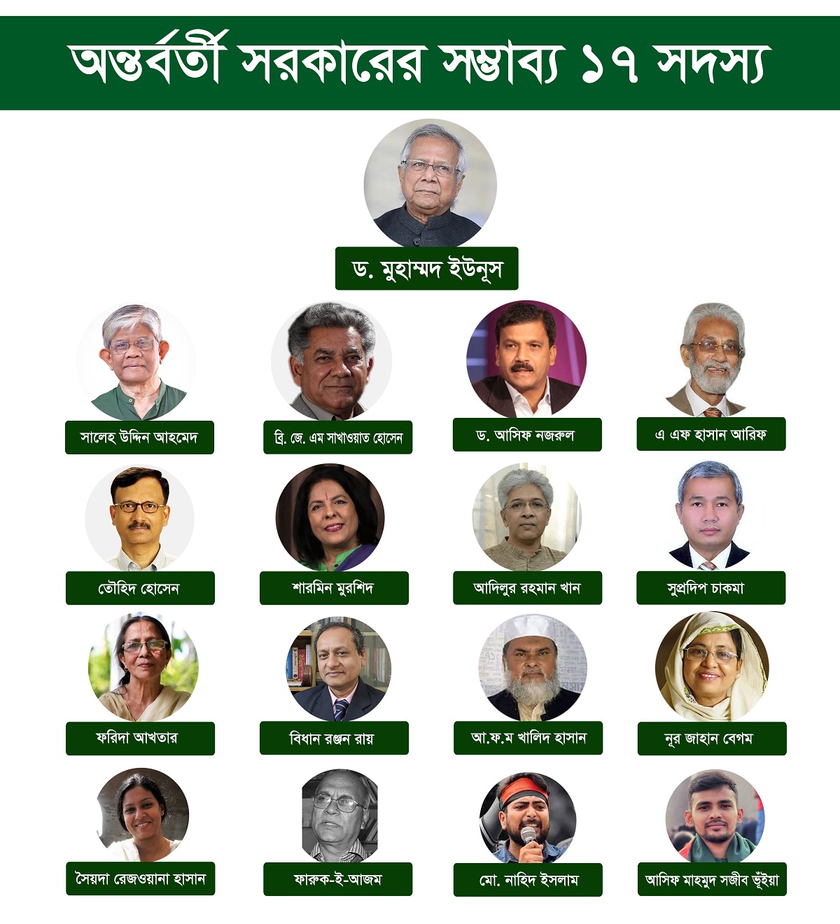 অন্তর্বর্তীকালীন সরকারের প্রধান হচ্ছেন নোবেলজয়ী অর্থনীতিবিদ ড. মুহাম্মদ ইউনূস। এ সরকারে ১৬ সদস্যের তালিকা নিম্নরূপ হতে পারে বলে বিশ্বস্ত একটি সূত্রে জানা গেছে-