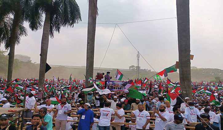 ‘প্যালেস্টাইন সলিডারিটি মুভমেন্ট বাংলাদেশ’আয়োজিত এ কর্মসূচি শনিবার (১২ এপ্রিল) বিকেল ৩টায় শুরু হওয়ার কথা থাকলেও প্রচণ্ড রোদ-গরম উপেক্ষা করে সকাল থেকে ঢাকার বিভিন্ন পয়েন্ট থেকে খণ্ড খণ্ড মিছিল নিয়ে সোহরাওয়ার্দী উদ্যানে আসতে থাকেন লোকজন। এসময় তাদের হাতে বাংলাদেশ ও ফিলিস্তিনি পতাকা দেখা গেছে।
