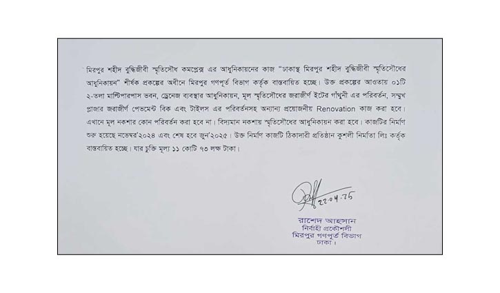 রাশেদ আহসান বলেন, ‘‘মিরপুর শহীদ বুদ্ধিজীবী স্মৃতিসৌধের আধুনিকায়ন নামের একটি প্রকল্পের আওতায় একটি দুই তলা মাল্টিপারপাস ভবন, নিষ্কাশন ব্যবস্থার উন্নয়ন, মূল স্মৃতিসৌধের জরাজীর্ণ ইটের গাঁথুনি পরিবর্তন, সামনের প্লাজার জরাজীর্ণ পেভমেন্টের ইট এবং টাইলসের পরিবর্তন করা হবে।”