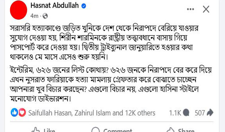 এ প্রসঙ্গে হাসনাত প্রশ্ন তুলে বলেন, “ইন্টেরিম, ৬২৬ জনের লিস্ট কোথায়? ৬২৬ জনকে নিরাপদে বের করে দিয়ে এখন নুসরাত ফারিয়াকে হত্যা মামলায় গ্রেপ্তার করে বোঝাতে চাচ্ছেন আপনারা খুব বিচার করছেন? এগুলো বিচার নয়, এগুলো হাসিনা স্টাইলে মনোযোগ ডাইভারশন।”
