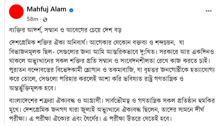 তিনি বলেন, “দেশপ্রেমিক শক্তির ঐক্য অনিবার্য। আগেকার যেকোনো বক্তব্য ও শব্দচয়ন, যা বিভাজনমূলক ছিল- সেগুলোর জন্য আমি আন্তরিকভাবে দুঃখিত। সরকারে আর একদিনও থাকলে অভ্যুত্থানের সব শক্তির প্রতি সম্মান ও সংবেদনশীলতা রেখে কাজ করতে চাই। পুরাতন বন্দোবস্তের বিভেদকামী স্লোগান ও তকমাবাজি, যা বৃহত্তর জনগোষ্টীকে হত্যাযোগ্য করে তোলে, সেগুলো পরিহার করলেই আশা করি ভবিষ্যৎ রাষ্ট্র গণতান্ত্রিক ও অন্তর্ভুক্তিমূলক হবে।”