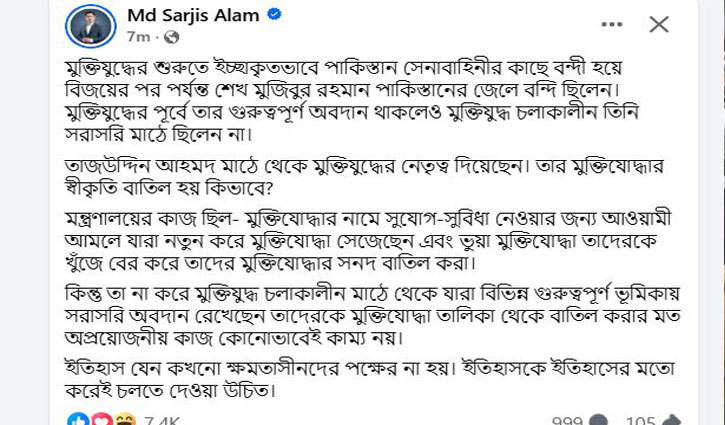 তিনি বলেন, ‘শেখ মুজিবুর রহমান, তাজউদ্দিন আহমেদসহ মুক্তিযুদ্ধের নেতাদের মুক্তিযোদ্ধা সার্টিফিকেট বাতিল- একটা ফেইক নিউজ। নতুন অধ্যাদেশে মুজিবনগর সরকারের সব সদস্যকে মুক্তিযোদ্ধার স্পষ্ট স্বীকৃতি দেওয়া আছে।”