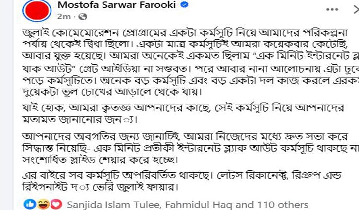 সেখানে তিনি লেখেন, “জুলাই কোমেমোরেশন প্রোগ্রামের একটা কর্মসূচি নিয়ে আমাদের পরিকল্পনা পর্যায় থেকেই দ্বিধা ছিলো। একটা মাত্র কর্মসূচিই আমরা কয়েকবার কেটেছি, আবার যুক্ত হয়েছে। আমরা অনেকেই একমত ছিলাম “এক মিনিট ইন্টারনেট ব্ল্যাক আউট” গ্রেট আইডিয়া না সম্ভবত। পরে আবার নানা আলোচনায় এটা ঢুকে পড়ে কর্মসূচিতে। অনেক বড় কর্মসূচি এবং বড় একটা দল কাজ করলে এরকম দুয়েকটা ভুল চোখের আড়ালে থেকে যায়। যাই হোক, আমরা কৃতজ্ঞ আপনাদের কাছে, সেই কর্মসূচি নিয়ে আপনাদের মতামত জানানোর জন্য। আপনাদের অবগতির জন্য জানাচ্ছি, আমরা নিজেদের মধ্যে দ্রুত সভা করে সিদ্ধান্ত নিয়েছি- এক মিনিট প্রতীকী ইন্টারনেট ব্ল্যাক আউট কর্মসূচি থাকছে না। সংশোধিত স্লাইড শেয়ার করে হচ্ছে।”
