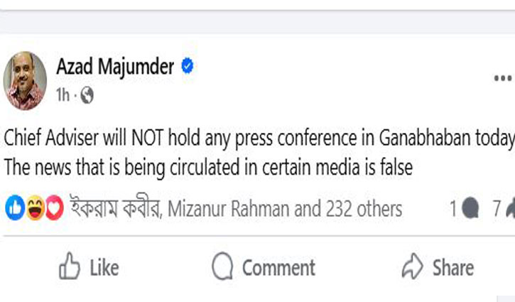 এ তথ্য সঠিক নয় জানিয়ে উপ-প্রেস সচিব আবুল কালাম আজাদ মজুমদার লেখেন, “প্রধান উপদেষ্টা আজ গণভবনে কোনো প্রেস ব্রিফিং করবেন না। কিছু সংবাদমাধ্যমে প্রচারিত খবরটি ভুয়া।”