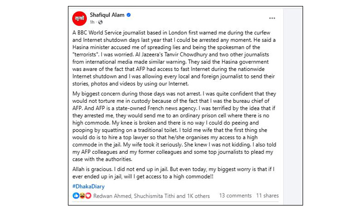 প্রেস সচিব আরো লিখেছেন, “গত বছরের কারফিউ ও ইন্টারনেট শাটডাউনের সময় লন্ডনভিত্তিক বিবিসি ওয়ার্ল্ড সার্ভিসের এক সাংবাদিক প্রথম আমাকে সতর্ক করেন, যেকোনো মুহূর্তে আমাকে গ্রেপ্তার করা হতে পারে। তিনি (বিবিসির সাংবাদিক) বলেন, হাসিনা সরকারের এক মন্ত্রী আমাকে মিথ্যা প্রচারের অভিযোগে এবং ‘সন্ত্রাসীদের মুখপাত্র’ হিসেবে অভিযুক্ত করেছেন। আমি তখন উদ্বিগ্ন হয়ে পড়ি। আল জাজিরার তানভীর চৌধুরী এবং আরো দুজন আন্তর্জাতিক গণমাধ্যমকর্মী একই রকম সতর্কবার্তা দেন। তারা বলেন, হাসিনা সরকার জানে যে, ইন্টারনেট শাটডাউনের সময়েও এএফপির দ্রুতগতির ইন্টারনেট চালু ছিল এবং আমি দেশি-বিদেশি সাংবাদিকদের সেই ইন্টারনেট ব্যবহার করে তাদের রিপোর্ট, ছবি ও ভিডিও পাঠাতে সহায়তা করছিলাম।”