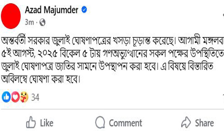 সেখানে তিনি লেখেন, “অন্তর্বর্তী সরকার জুলাই ঘোষণাপত্রের খসড়া চূড়ান্ত করেছে। আগামী মঙ্গলবার, ৫ই আগস্ট, ২০২৫ বিকেল ৫ টায় গণঅভ্যুত্থানের সকল পক্ষের উপস্থিতিতে জুলাই ঘোষণাপত্র জাতির সামনে উপস্থাপন করা হবে। এ বিষয়ে বিস্তারিত অবিলম্বে ঘোষণা করা হবে।”