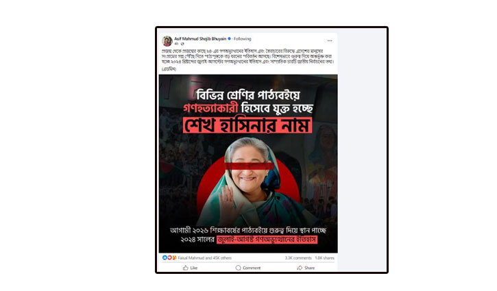 এই পোস্টের সঙ্গেই তিনি একটি ফটোকার্ড শেয়ার করেন ফেসবুকে। যেখানে ক্ষমতাচ্যুত প্রধানমন্ত্রী শেখ হাসিনার ছবির সঙ্গে ফটোকার্ডে লেখা রয়েছে-‘বিভিন্ন শ্রেণির পাঠ্যবইয়ে গণহত্যাকারী হিসাবে যুক্ত হচ্ছে শেখ হাসিনার নাম।’