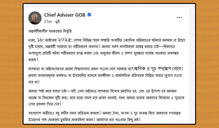 অন্তর্বর্তী সরকারের বিবৃতিতে বলা হয়, “বাংলাদেশ অতীতেও বহু কঠিন সময় অতিক্রম করেছে। আমরা ঐক্য, সংযম ও দৃঢ় সংকল্প নিয়ে আমাদের গণতন্ত্রের উত্তরণের পথে যেকোনো হুমকির মোকাবিলা করব। আমাদের ভয় পাওয়ার কিছু নেই।”