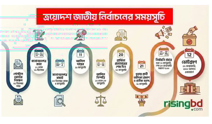 ইসির দেওয়া তথ্য অনুযায়ী, মনোনয়নপত্র বাছাই ৩০ ডিসেম্বর থেকে ৪ জানুয়ারি পর্যন্ত। রিটার্নিং কর্মকর্তার আদেশের বিরুদ্ধে কমিশনে আপিল করার সময় ৫ থেকে ৯ জানুয়ারি। আপিল নিষ্পত্তি ১০ থেকে ১৮ জানুয়ারি, প্রার্থিতা প্রত্যাহারের শেষ সময় ২০ জানুয়ারি। চূড়ান্ত প্রার্থী তালিকা প্রকাশ ও প্রতীক বরাদ্দ ২১ জানুয়ারি। নির্বাচনি প্রচারণা চলবে ২২ জানুয়ারি থেকে ভোট শুরুর ৪৮ ঘণ্টা আগপর্যন্ত। অর্থাৎ ১০ ফেব্রুয়ারি সকাল সাড়ে ৭টা পর্যন্ত।