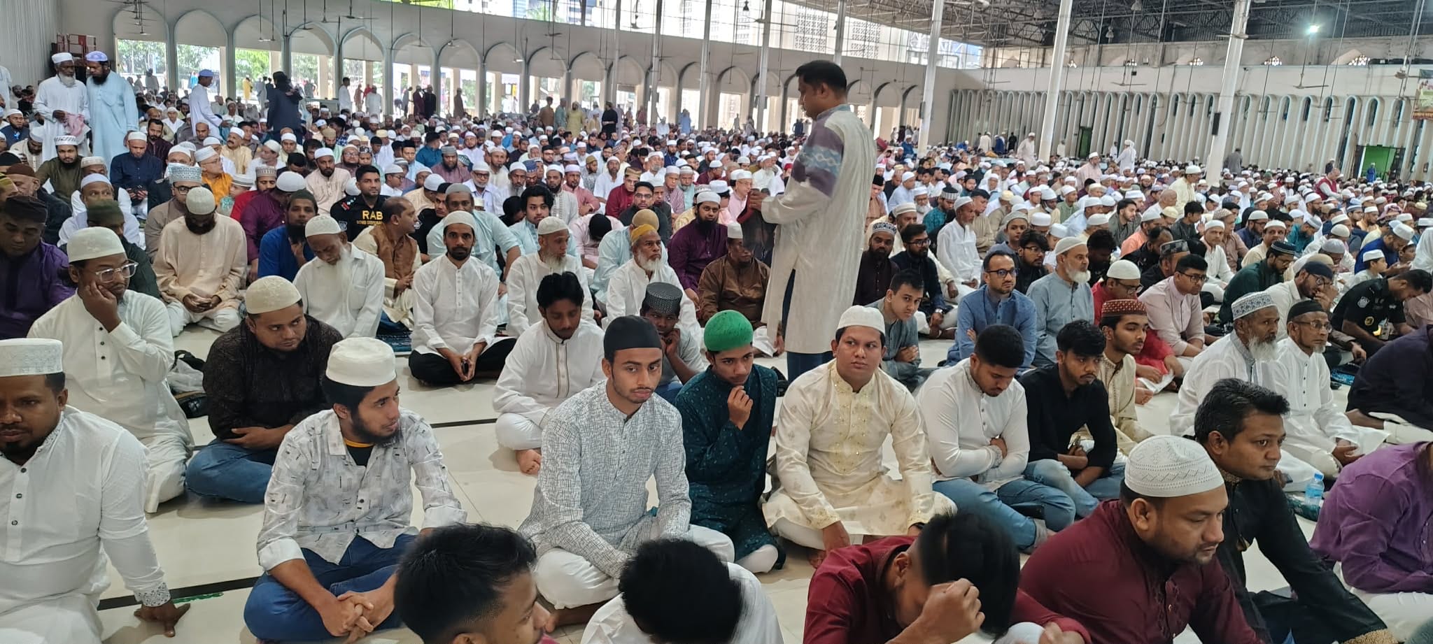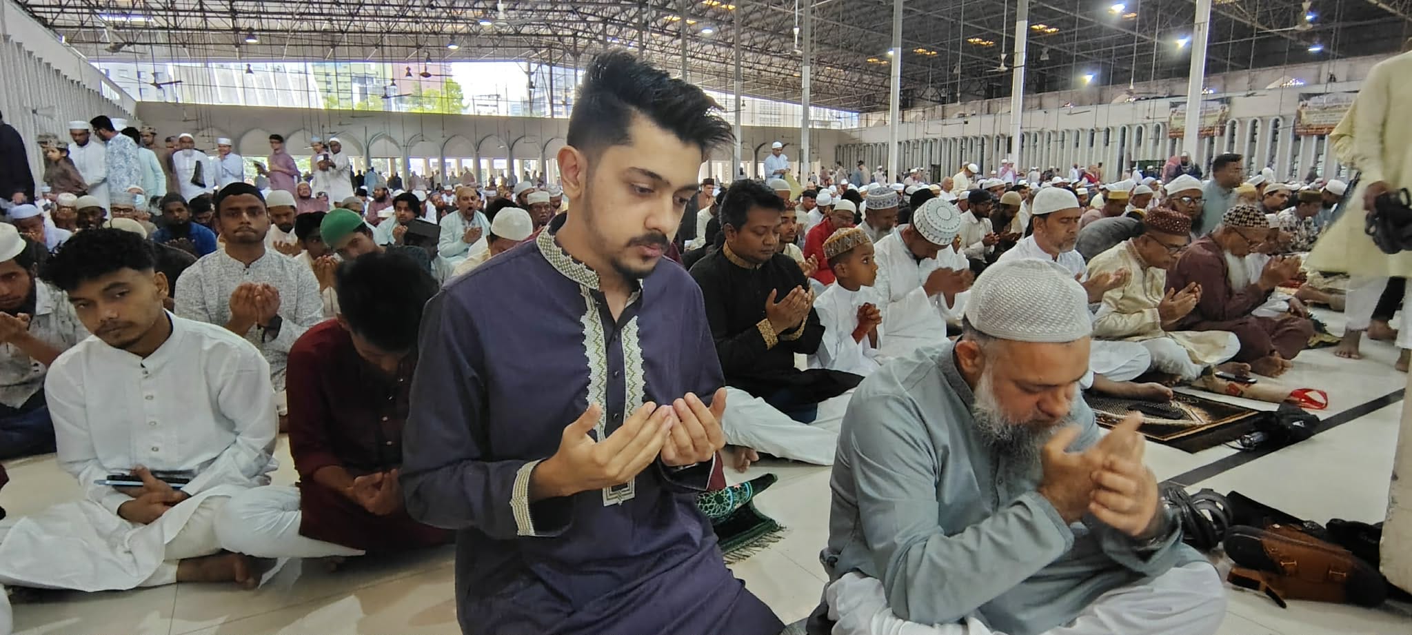 মেঘলা আকাশে বৃষ্টির শঙ্কা নিয়েও শনিবার পবিত্র ঈদুল ফিতরের জামাতে মুসল্লির ঢল নেমেছে। সাতটার আগেই মুসল্লির উপস্থিতিতে বায়তুল মোকাররম জাতীয় মসজিদের উপরে নিচে কানায় কানায় পূর্ণ হয়ে যায়। মুসল্লি জায়গা না পেয়ে মসজিদের বাইরে সিঁড়িতে, সিঁড়ির নিচে যে যেখানে জায়গা পেয়েছেন নামাজ আদায় করেছেন। রাজধানীর দূর-দূরান্ত থেকে ছোট ছোট শিশু সন্তানকে সঙ্গে নিয়ে আসা মুসল্লিরা বায়তুল মোকাররমের প্রথম ঈদ জামাত আদায় করেন। নামাজ শেষে মোনাজাতে মুসল্লিরা নিজেদের জন্য, মা-বাবা-পরিবারের জন্য, নিপীড়িত বিশ্বমুসলিম বিশেষ করে ইরান, ফিলিস্তিনসহ মুসলিম উম্মাহর জন্য আল্লাহর কাছে দোয়া চেয়েছেন।
