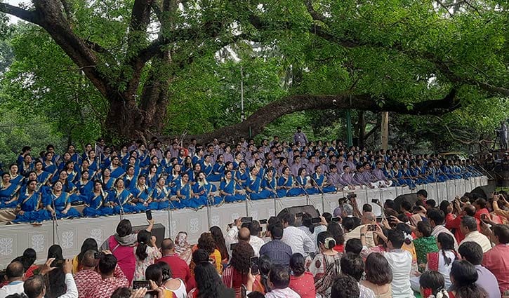 সকাল ৬টা ১৫ মিনিটে শুরু হওয়া এ আয়োজনের সূচনা হয় সম্মেলক কণ্ঠে ‘জাগো আলোক-লগনে’ গান পরিবেশনার মধ্য দিয়ে। প্রকৃতির স্নিগ্ধ পরিবেশ আর সংগীতের আবহে নতুন বছরের প্রথম প্রহর হয়ে ওঠে আবেগঘন ও প্রাণময়। এবারের মূল প্রতিপাদ্য নির্ধারণ করা হয়েছে- ‘চিত্ত যেথা ভয়শূন্য, উচ্চ যেথা শির’।