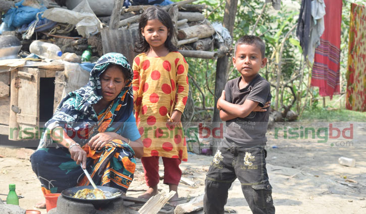 পরিবারের জন্য রান্না করছেন গ্রামের নারী। খাবার অপেক্ষায় তার পাশেই অবস্থান নিয়ে আছে দুই শিশু।