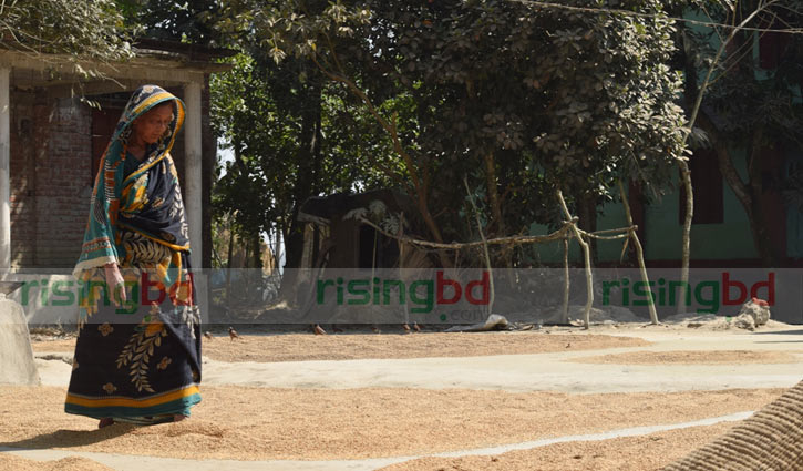 ধান সিদ্ধ, রোদে সেই ধান শুকাতে দেয়া, বারবার ধানগুলো পা দিয়ে নেড়ে দেয়ার কাজ করছেন গ্রামীণ নারী।