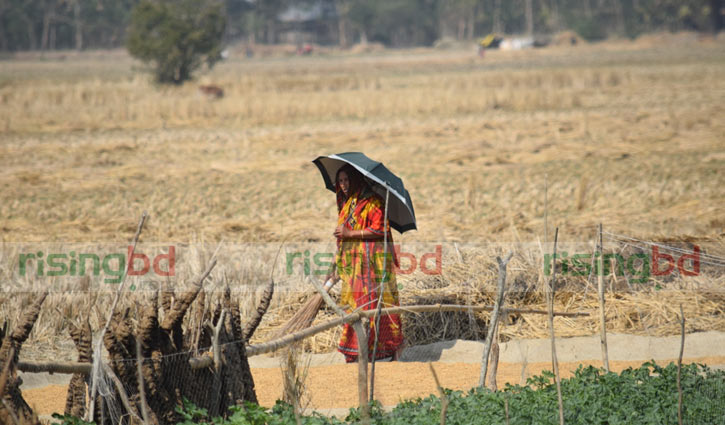 তীব্র রোদে ছাতা মাথায় দিয়ে ধান শুকানোর কাজে ব্যস্ত এক নারী।
