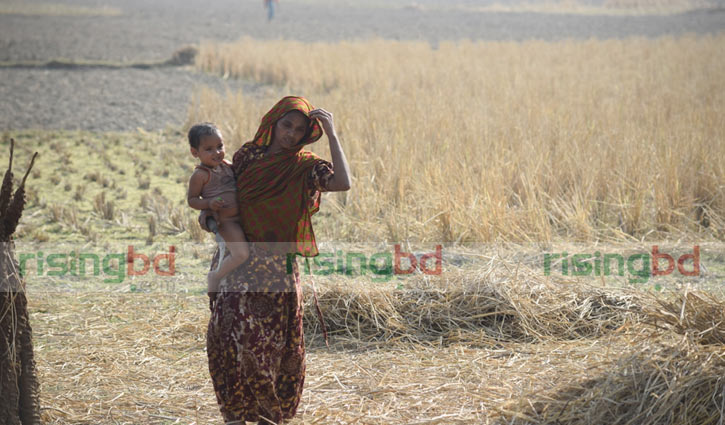 ক্ষেতের কাজ গুছিয়ে শিশু সন্তানকে কোলে নিয়ে ঘরে ফিরছেন এক নারী। ফিরেই আবার রান্না বসাতে হবে পরিবারের জন্য।