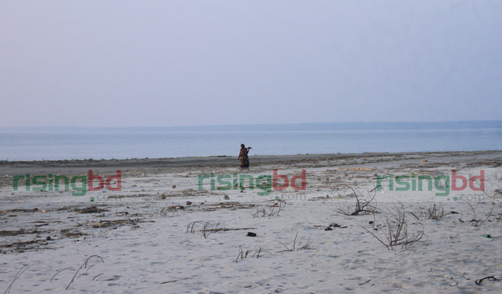 শেষ দুপুরে নদীর বালুকাবেলায় কাজের প্রয়োজনে ছুটছেন এক নারী।