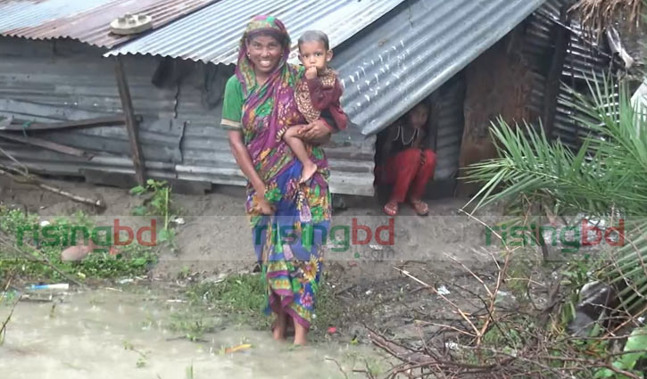 ঘরের আঙিনায় চলে এসেছে জোয়ারের পানি, শিশু সন্তানকে কোলে নিয়ে দাঁড়িয়ে থাকা এই নারীর মুখে তবুও বেঁচে থাকার হাঁসি।