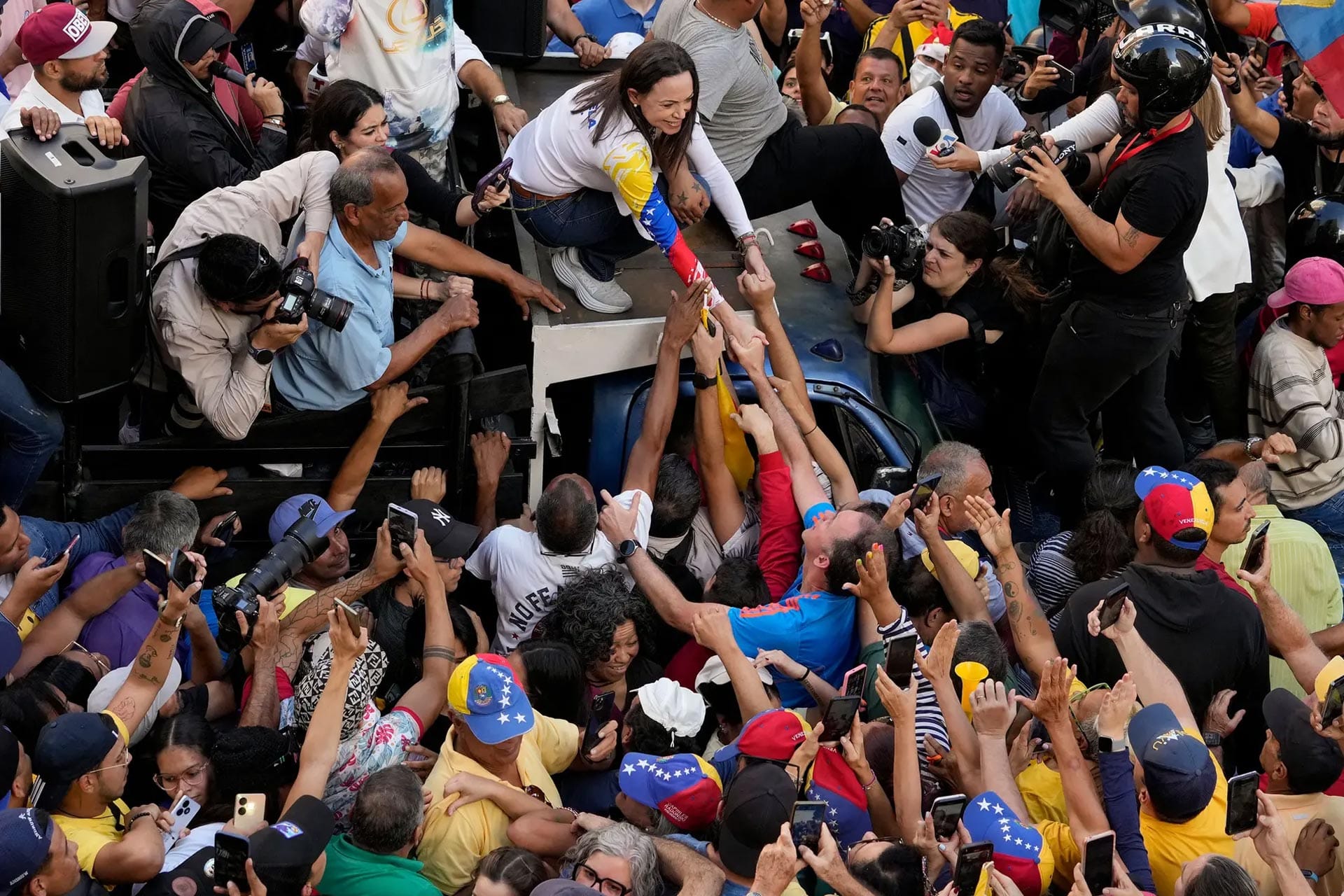 ভেনেজুয়েলার প্রেসিডেন্ট নিকোলাস মাদুরোর বিরুদ্ধে দেশটির কারাকাসে এক বিক্ষোভে সমর্থকদের অভিবাদন জানান বিরোধী দলীয় নেতা মারিয়া করিয়া মাচাদো। চলতি বছরের ৯ জানুয়ারি অর্থাৎ তার তৃতীয় মেয়াদের শপথ গ্রহণের আগের দিন চিত্রটি ধারণ করা হয় (আরিয়ানা কুবিলোস, এপি)।