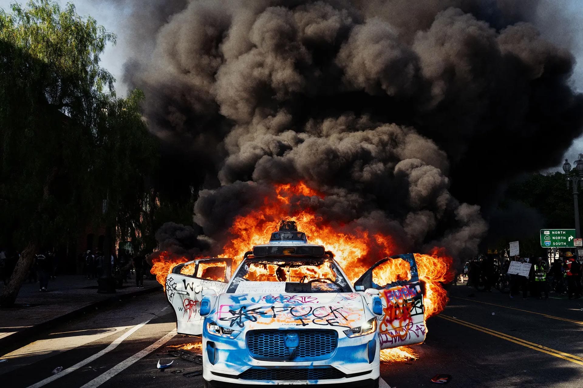 চলতি বছরের ৮ জুন, মার্কিন যুক্তরাষ্ট্রের লস অ্যাঞ্জেলেসের ডাউনটাউনে বিক্ষোভ চলাকালে একটি ওয়েমো গাড়ি আগুনে পুড়ে যায়। ছবি: ইথান নোয়া রয়
