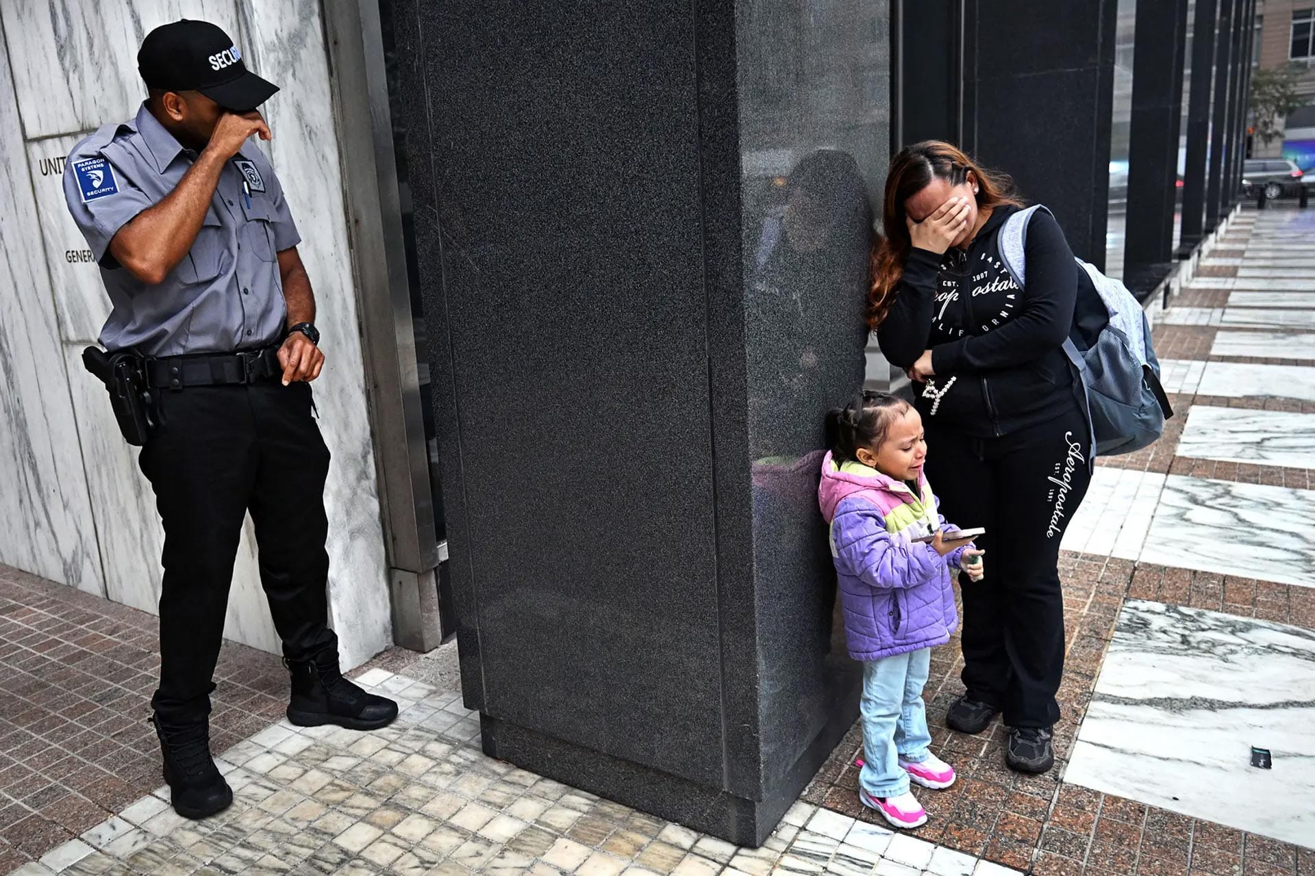 চলতি বছরের ২০ আগস্ট, মার্কিন যুক্তরাষ্ট্রের নিউ ইয়র্কে আইসিইর হাতে এক ব্যক্তি আটক হন। ওই ব্যক্তির স্ত্রী তার শিশু কন্যাকে নিয়ে ফেডারেল ভবনের বাইরে কান্নায় ভেঙে পড়েন। এ দৃশ্য দেখে একজন নিরাপত্তারক্ষীও অশ্রুসিক্ত হন। তবে জানা যায়নি, আটক ব্যক্তির বিরুদ্ধে কোনো ফৌজদারি অভিযোগ ছিল কি না। ছবি: ক্যারল গুজি