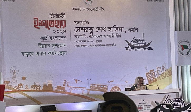 আওয়ামী লীগের নির্বাচনি ইশতেহার ঘোষণা করছেন শেখ হাসিনা