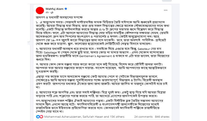 ‘জনগণ ও মধ্যবর্তী অবস্থানের সপক্ষে’ শিরোনামে নিজের ভেরিফায়েড ফেসবুকে দেওয়া স্ট্যাটাসে মাহফুজ আলম বলেন, ‘এ অভ্যুত্থান সবার। সে জন্যই মাস্টারমাইন্ড নামক মিডিয়ার তৈরি হাইপকে আমি শুরুতেই প্রত্যাখ্যান করেছি। আমরা সিদ্ধান্ত যারা নিতাম, তারা প্রায় সকল সিদ্ধান্তের ক্ষেত্রে অনেক স্টেকহোল্ডারদের সঙ্গে কথা বলেছি। একটা সিদ্ধান্ত ফাইনালাইজ করতে অন্তত ৫/৬ টা গ্রুপের মতামত শুনে বিশ্লেষণ করে সিদ্ধান্ত নিতে হইসে। ফলে, এটা আসলে আমাদের সিদ্ধান্ত নেওয়া বডির সামষ্টিক কৌশলগত সক্ষমতা যেমন, তেমনি অনেকগুলো গ্রুপ অব পিপলের অংশগ্রহণ ও পরামর্শের ও ফসল। কেউই অনুল্লেখযোগ্য নন। আর, জনগণ তো ১৯-৩৩ জুলাই কারো সিদ্ধান্তের জন্য বসে থাকেনি। তবে, তারা অবশ্যই পাবিলিক- প্রাইভেট থেকে শুরু করে মাদ্রাসা- স্কুল- কলেজের ছাত্রদেরকেই লেজিটিমেট নেতৃত্ব হিসেবে মানতেন।”