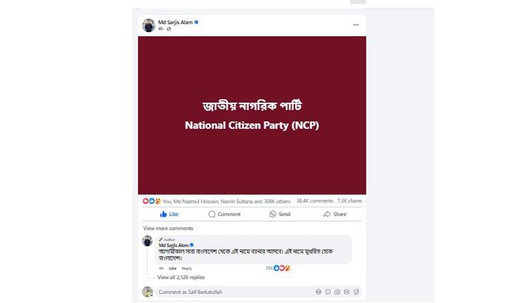 নতুন দলের শীর্ষ নেতা সারজিস আলমের ফেসবুক পোস্ট