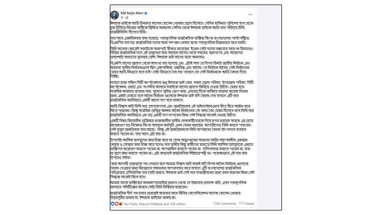 সারজিস আলমের ফেসবুক পোস্ট