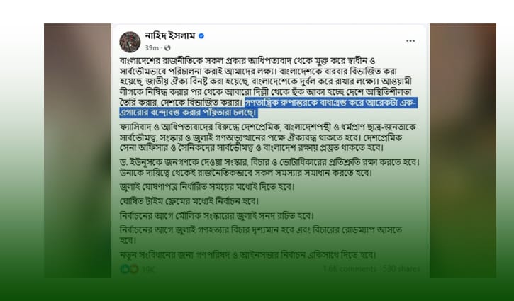 ফেসবুক পোস্টে নাহিদ ইসলাম বলেন, “বাংলাদেশের রাজনীতিকে সকল প্রকার আধিপত্যবাদ থেকে মুক্ত করে স্বাধীন ও সার্বভৌমভাবে পরিচালনা করাই আমাদের লক্ষ্য। বাংলাদেশকে বারবার বিভাজিত করা হয়েছে, জাতীয় ঐক্য বিনষ্ট করা হয়েছে, বাংলাদেশেকে দুর্বল করে রাখার লক্ষ্যে।”