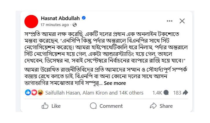 সেখানে তিনি লেখেন, “সম্প্রতি আমরা লক্ষ্য করেছি, একটি দলের প্রধান এক অনলাইন টকশোতে মন্তব্য করেছেন, ‘এনসিপি কিন্তু পর্দার অন্তরালে বিএনপির সাথে সিট নেগোসিয়েশন করেছে। আমরা হাইপোথেটিকালি ধরে নিলাম, পর্দার অন্তরালে সিট নেগোসিয়েশন হয়ে গেল, একটা আন্ডারস্ট্যাডিং হয়ে গেল, তাহলে দেখবেন, ডিসেম্বর না, সবাই সেপ্টেম্বরে নির্বাচনের ব্যাপারে রাজি হয়ে যাবে।’ আমরা উল্লেখিত রাজনীতিবিদের প্রতি আমাদের সম্মান ও সৌহার্দ্যপূর্ণ সম্পর্ক বজায় রেখে বলতে চাই, বিএনপি বা অন্য কোনো দলের সাথে আসন ভাগাভাগির সমঝোতার দাবি সম্পূর্ণ ভিত্তিহীন।”