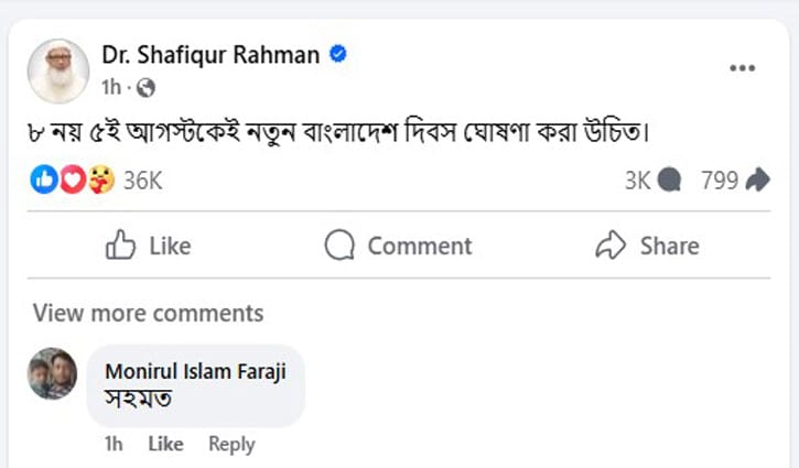 ডা. শফিকুর রহমান ফেসবুকে লিখেছেন, ‘৮ নয় ৫ই আগস্টকেই নতুন বাংলাদেশ দিবস ঘোষণা করা উচিত।’