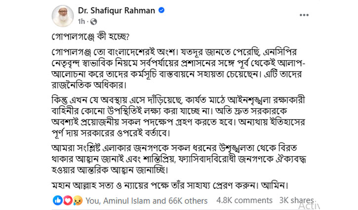 পোস্টে জামায়াতের আমির লিখেছেন, ‘‘গোপালগঞ্জ তো বাংলাদেশেরই অংশ। যত দূর জানতে পেরেছি, এনসিপির নেতৃবৃন্দ স্বাভাবিক নিয়মে সর্বপর্যায়ের প্রশাসনের সঙ্গে পূর্ব থেকেই আলাপ-আলোচনা করে তাদের কর্মসূচি বাস্তবায়নে সহায়তা চেয়েছেন। এটি তাদের রাজনৈতিক অধিকার। কিন্তু এখন যে অবস্থায় এসে দাঁড়িয়েছে, কার্যত মাঠে আইনশৃঙ্খলা রক্ষাকারী বাহিনীর কোনো উপস্থিতিই লক্ষ্য করা যাচ্ছে না। অতিদ্রুত সরকারকে অবশ্যই প্রয়োজনীয় সকল পদক্ষেপ গ্রহণ করতে হবে। অন্যথায় ইতিহাসের পূর্ণ দায় সরকারের ওপরেই বর্তাবে।’’