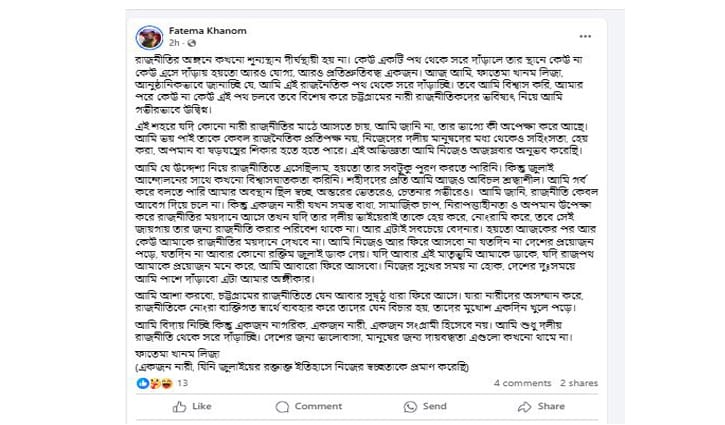 “রাজনীতির অঙ্গনে কখনো শূন্যস্থান দীর্ঘস্থায়ী হয় না। কেউ একটি পথ থেকে সরে দাঁড়ালে তার স্থানে কেউ না কেউ এসে দাঁড়ায় হয়তো আরও যোগ্য, আরও প্রতিশ্রুতিবদ্ধ একজন। আজ আমি, ফাতেমা খানম লিজা, আনুষ্ঠানিকভাবে জানাচ্ছি যে, আমি এই রাজনৈতিক পথ থেকে সরে দাঁড়াচ্ছি। তবে আমি বিশ্বাস করি, আমার পরে কেউ না কেউ এই পথ চলবে তবে বিশেষ করে চট্টগ্রামের নারী রাজনীতিকদের ভবিষ্যৎ নিয়ে আমি গভীরভাবে উদ্বিগ্ন।