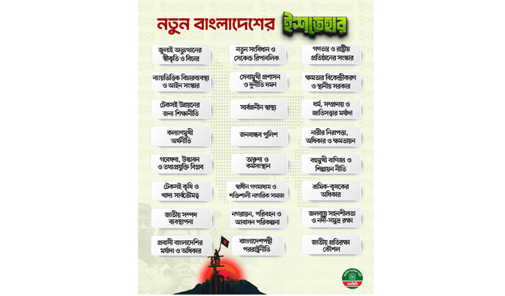 ‘নতুন বাংলাদেশের ইশতেহার’ আনুষ্ঠানিকভাবে ঘোষণা করেছে জাতীয় নাগরিক পার্টি (এনসিপি)।