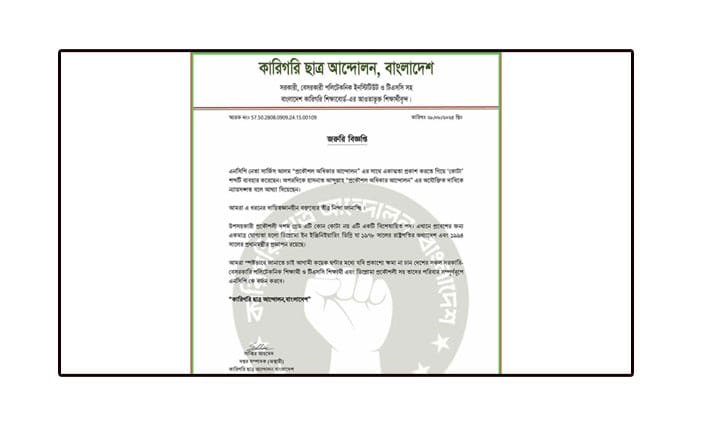 বিজ্ঞপ্তিতে বলা হয়, এনসিপি নেতা সারজিস আলম ‘প্রকৌশল অধিকার আন্দোলন’ এর প্রতি সমর্থন জানাতে গিয়ে ‘কোটা’ শব্দ ব্যবহার করেছেন। অন্যদিকে, হাসনাত আব্দুল্লাহ এই আন্দোলনের দাবি ন্যায়সঙ্গত বলে মন্তব্য করেছেন। সংগঠনটির দাবি, এসব বক্তব্য দায়িত্বজ্ঞানহীন এবং বিভ্রান্তিকর।