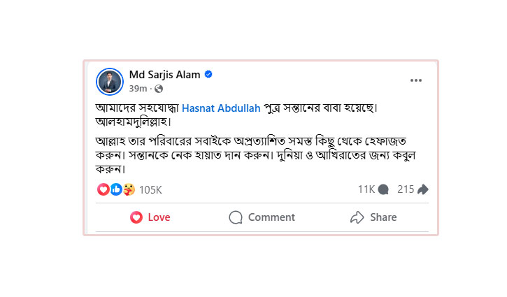 ফেসবুক পোস্টে সারজিস আলম লিখেছেন, ‘‘আমাদের সহযোদ্ধা হাসনাত আবদুল্লাহ পুত্র সন্তানের বাবা হয়েছে। আলহামদুলিল্লাহ। আল্লাহ তার পরিবারের সবাইকে অপ্রত্যাশিত সমস্ত কিছু থেকে হেফাজত করুন। সন্তানকে নেক হায়াত দান করুন। দুনিয়া ও আখিরাতের জন্য কবুল করুন।’’