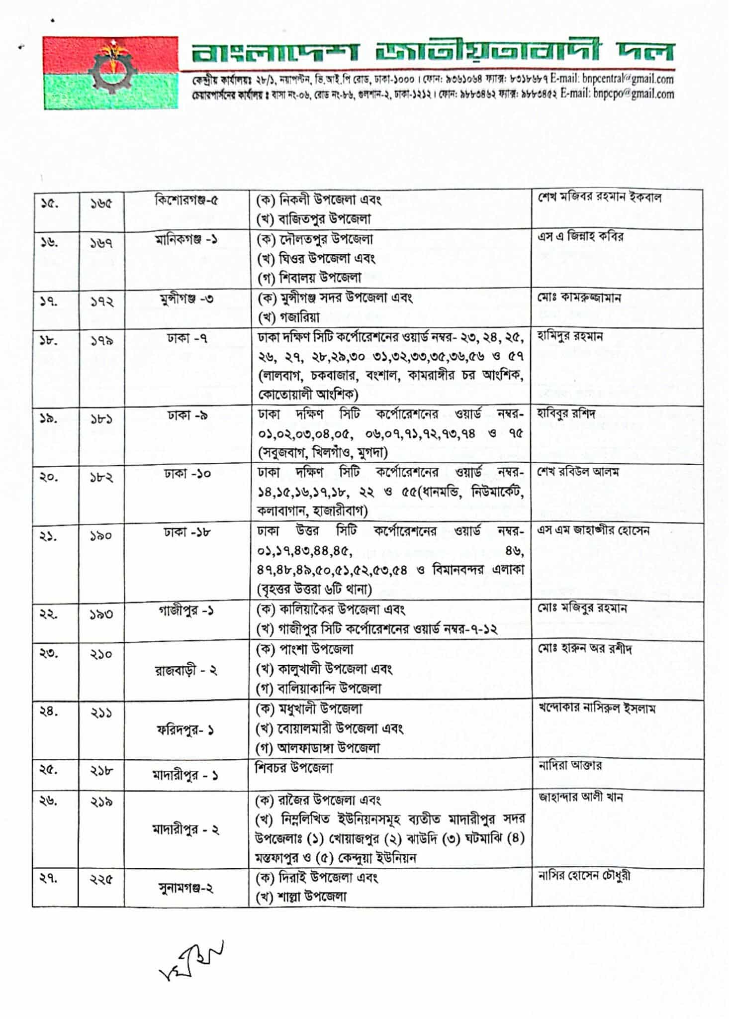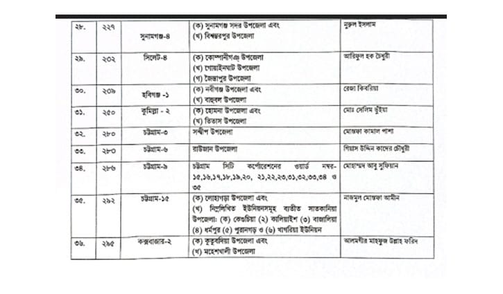 ঠাকুরগাঁও-২ আসনে আব্দুস সালাম, দিনাজপুর-৫ আসনে এ কে এম কামরুজ্জামান, নওগাঁ-৫ আসনে জাহিদুল ইসলাম ধলু, নাটোর-৩ আসনে মো. আনোয়ারুল ইসলাম, সিরাজগঞ্জ-১ আসনে সেলিম রেজা, যশোর-৫ আসনে এম ইকবাল হোসেন, নড়াইল-২ আসনে মো. মনিরুল ইসলাম, খুলনা-১ আসনে আমির এজাজ খান, পটুয়াখালী-২ আসনে মো. শহিদুল আলম তালুকদার, বরিশাল-৩ আসনে জয়নুল আবেদীন, ঝালকাঠি-১ আসনে রফিকুল ইসলাম জামাল।