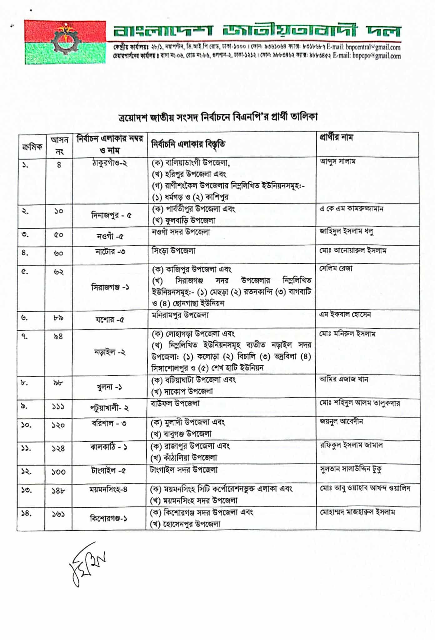 ত্রয়োদশ জাতীয় সংসদ নির্বাচনে আরো ৩৬টি আসনে প্রার্থী ঘোষণা করেছে বিএনপি।