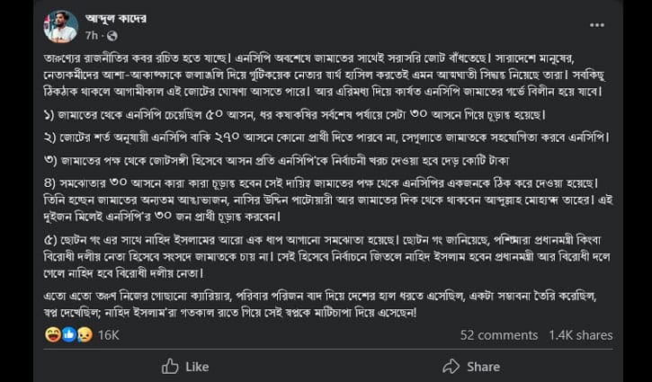 আব্দুল কাদের লিখেছেন, “তারুণ্যের রাজনীতির কবর রচিত হতে যাচ্ছে। এনসিপি অবশেষে জামাতের সাথেই সরাসরি জোট বাঁধতেছে। সারাদেশে মানুষের, নেতাকর্মীদের আশা-আকাঙ্ক্ষাকে জলাঞ্জলি দিয়ে গুটিকয়েক নেতার স্বার্থ হাসিল করতেই এমন আত্মঘাতী সিদ্ধান্ত নিয়েছে তারা। সবকিছু ঠিকঠাক থাকলে আগামীকাল এই জোটের ঘোষণা আসতে পারে। আর এরইমধ্য দিয়ে কার্যত এনসিপি জামাতের গর্ভে বিলীন হয়ে যাবে।’’