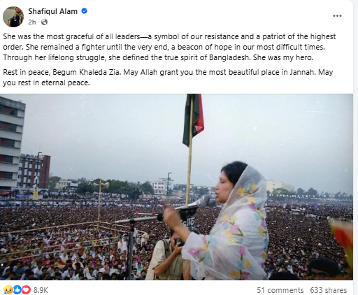 শোক জানিয়ে ফেসবুকে পোস্ট দিয়েছেন প্রধান উপদেষ্টার প্রেস সচিব শফিকুল আলম। তিনি লেখেন, “তিনি ছিলেন সব নেতার মধ্যে সবচেয়ে করুণাময় - আমাদের প্রতিরোধের প্রতীক এবং সর্বোচ্চ স্তরের একজন দেশপ্রেমিক। তিনি শেষ অবধি একজন যোদ্ধা ছিলেন। আমাদের সবচেয়ে কঠিন সময়ে আশার আলো। আজীবন সংগ্রামের মাধ্যমে তিনি বাংলাদেশের প্রকৃত চেতনাকে সংজ্ঞায়িত করেছেন। তিনি ছিলেন আমার নায়ক।”