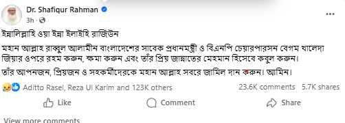 শোক প্রকাশ করেছেন বাংলাদেশ জামায়াতে ইসলামীর আমির ডা. শফিকুর রহমান। নিজের ভেরিফায়েড ফেসবুক থেকে পোস্ট দিয়ে তিনি লিখেছেন, “ইন্নালিল্লাহি ওয়া ইন্না ইলাইহি রাজিউন। মহান আল্লাহ রাব্বুল আলামীন বাংলাদেশের সাবেক প্রধানমন্ত্রী ও বিএনপি চেয়ারপারসন বেগম খালেদা জিয়ার ওপরে রহম করুন, ক্ষমা করুন এবং তার প্রিয় জান্নাতের মেহমান হিসেবে কবুল করুন। তার আপনজন, প্রিয়জন ও সহকর্মীদেরকে মহান আল্লাহ সবরে জামিল দান করুন। আমিন।”