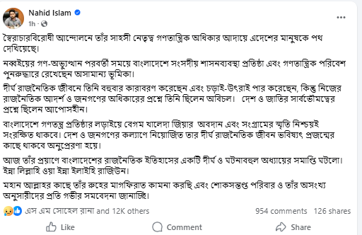 নাহিদ ইসলাম আরো লেখেন, “বাংলাদেশে গণতন্ত্র প্রতিষ্ঠার লড়াইয়ে বেগম খালেদা জিয়ার অবদান এবং সংগ্রামের স্মৃতি নিশ্চয়ই সংরক্ষিত থাকবে। দেশ ও জনগণের কল্যাণে নিয়োজিত তার দীর্ঘ রাজনৈতিক জীবন ভবিষ্যৎ প্রজন্মের কাছে থাকবে অনুপ্রেরণা হয়ে। আজ তাঁর প্রয়াণে বাংলাদেশের রাজনৈতিক ইতিহাসের একটি দীর্ঘ ও ঘটনাবহুল অধ্যায়ের সমাপ্তি ঘটলো। ইন্না লিল্লাহি ওয়া ইন্না ইলাইহি রাজিউন। মহান আল্লাহর কাছে তার রুহের মাগফিরাত কামনা করছি এবং শোকসন্তপ্ত পরিবার ও তার অসংখ্য অনুসারীদের প্রতি গভীর সমবেদনা জানাচ্ছি।”